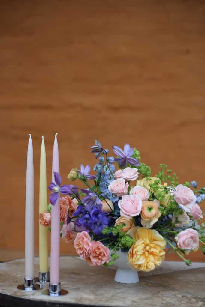 Sæt med 3 håndlavede stagelys fra Kunstindustrien med sølvlysestager fra Ester & Erik. Lysene matcher blomsterne, medmindre du ønsker en anden kombination.